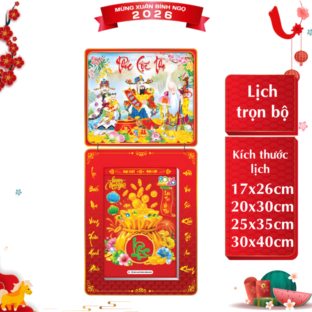 LỊCH TẾT 2026 Bloc 17x26cm – 20x30cm – 25×35 – 30x40cm – PHÚC LỘC THỌ Trọn Bộ Đầu Treo Laminate